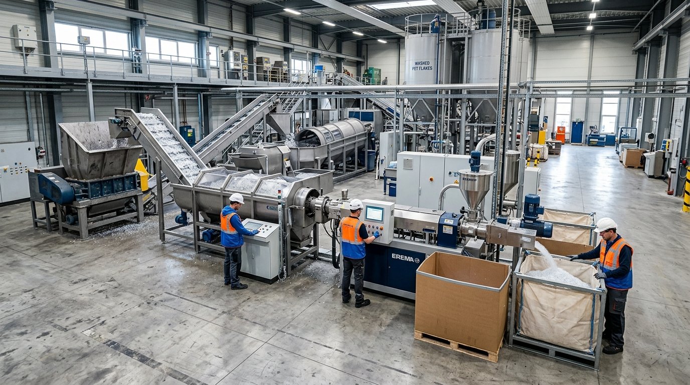 | Mixed curbside flake (dirty, >8% contamination) | 1,000–2,500 | >$1.2M | Lindner washing + Herbold granulator + EREMA extruder |